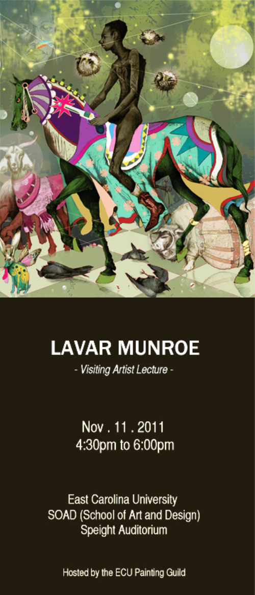 On Friday, November 11, 2011 from 4:30 to 6:00 pm the School of Art and Design (SOAD) at East Carolina University will host Bahamian fine artist Lavar Munroe in a Visiting Artist Lecture Series. The event is hosted by the ECU Painting Guild and will be held at the Speight Auditorium. Munroe will talk about the challenges of painting in the 21st century and show his older work, along with his silhouetted digital works and end with his recent complex digital renderings and mixed media drawings.